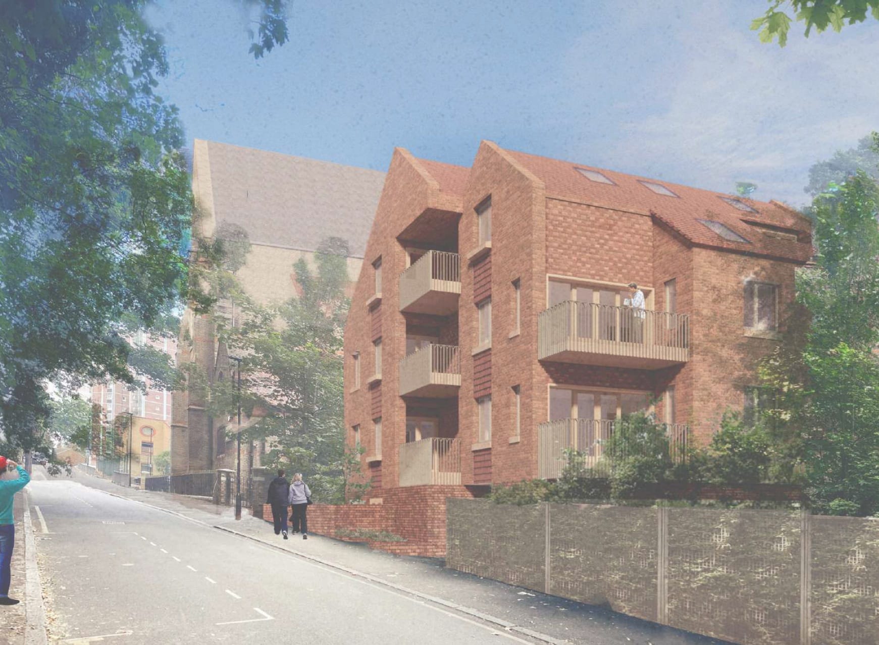 The development provides a sympathetic and subservient response to the adjacent Grade II listed church, incorporating a dual pitched roof and highly articulated facades, reducing the overall perceived scale of the building. Materials include red brick, stone and clay cladding in the façades and roof, reflecting the brick, and hung tiles used on the adjoining church. The material palette is cognisant of the setting, but their application is contemporary to ensure that the building reads as a building of and not a pastiche.