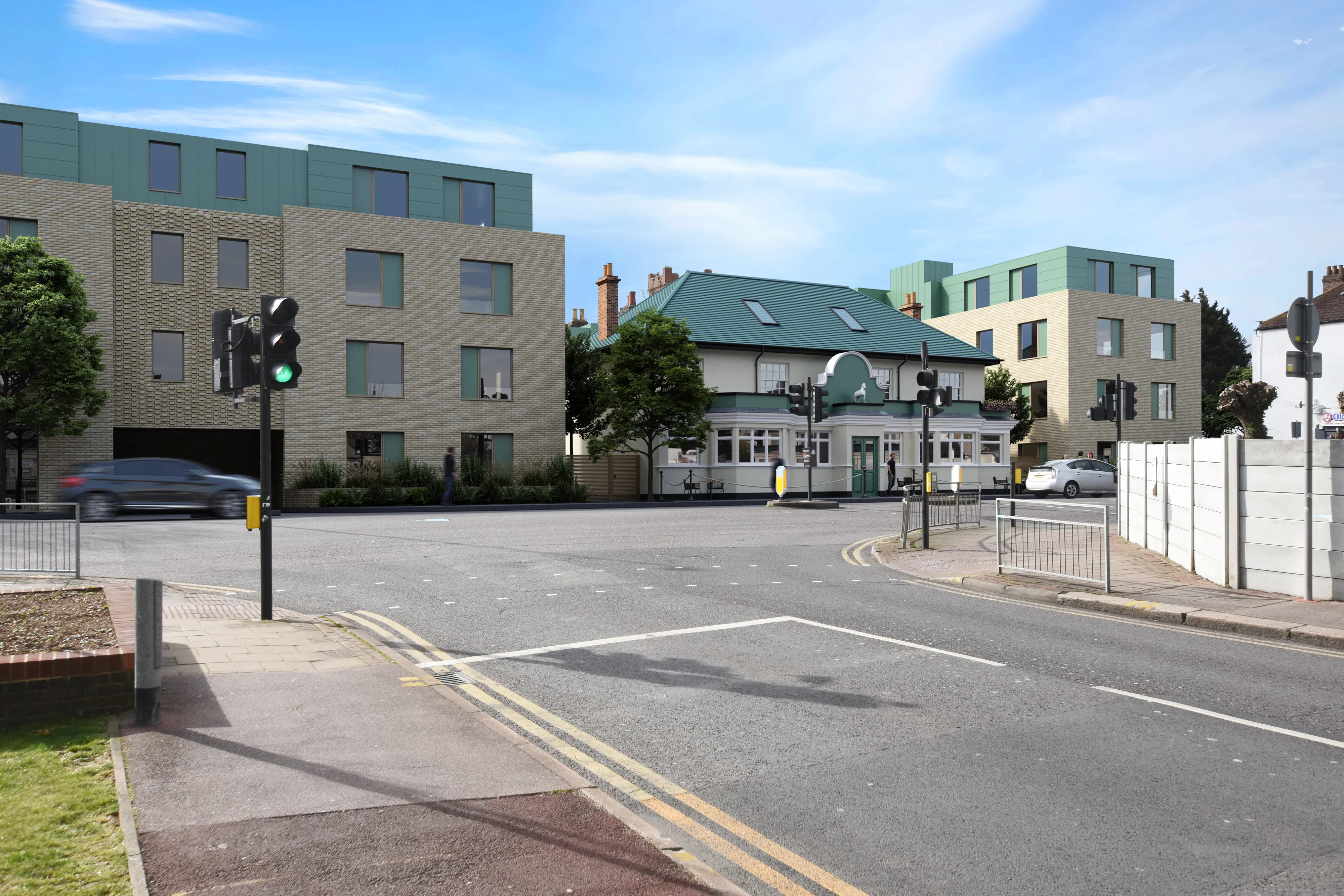 The development will demolish the single storey rear wing and other ad-hoc extensions to the Public House to allow the construction of part 3, part 4-storey buildings comprising 49 flats (15 x 1-bed, 20 x 2-bed and, 14 x 3-bed flats). The upper floors of the Public House are to be converted to provide 3 x 1-bed and 1 x 2-bed flats. Landscaping improvements along the High Road and St Chad’s Road frontages comprise additional mature street trees. The development also includes landscaping proposals for the rear Public House garden and a new residential courtyard.